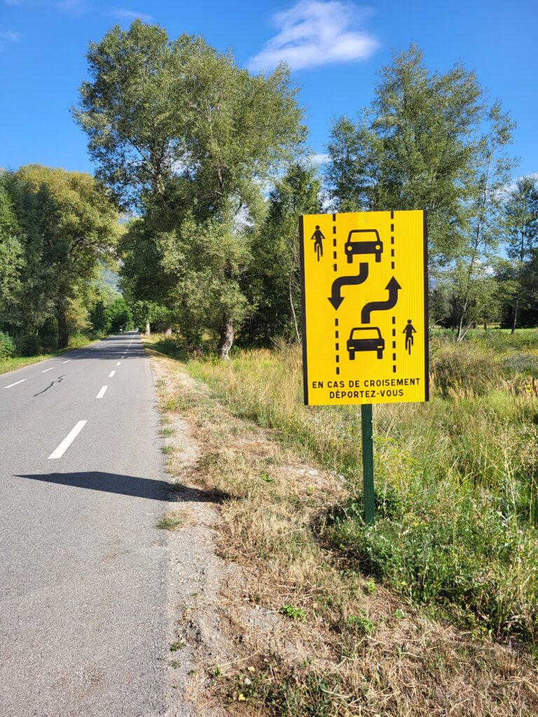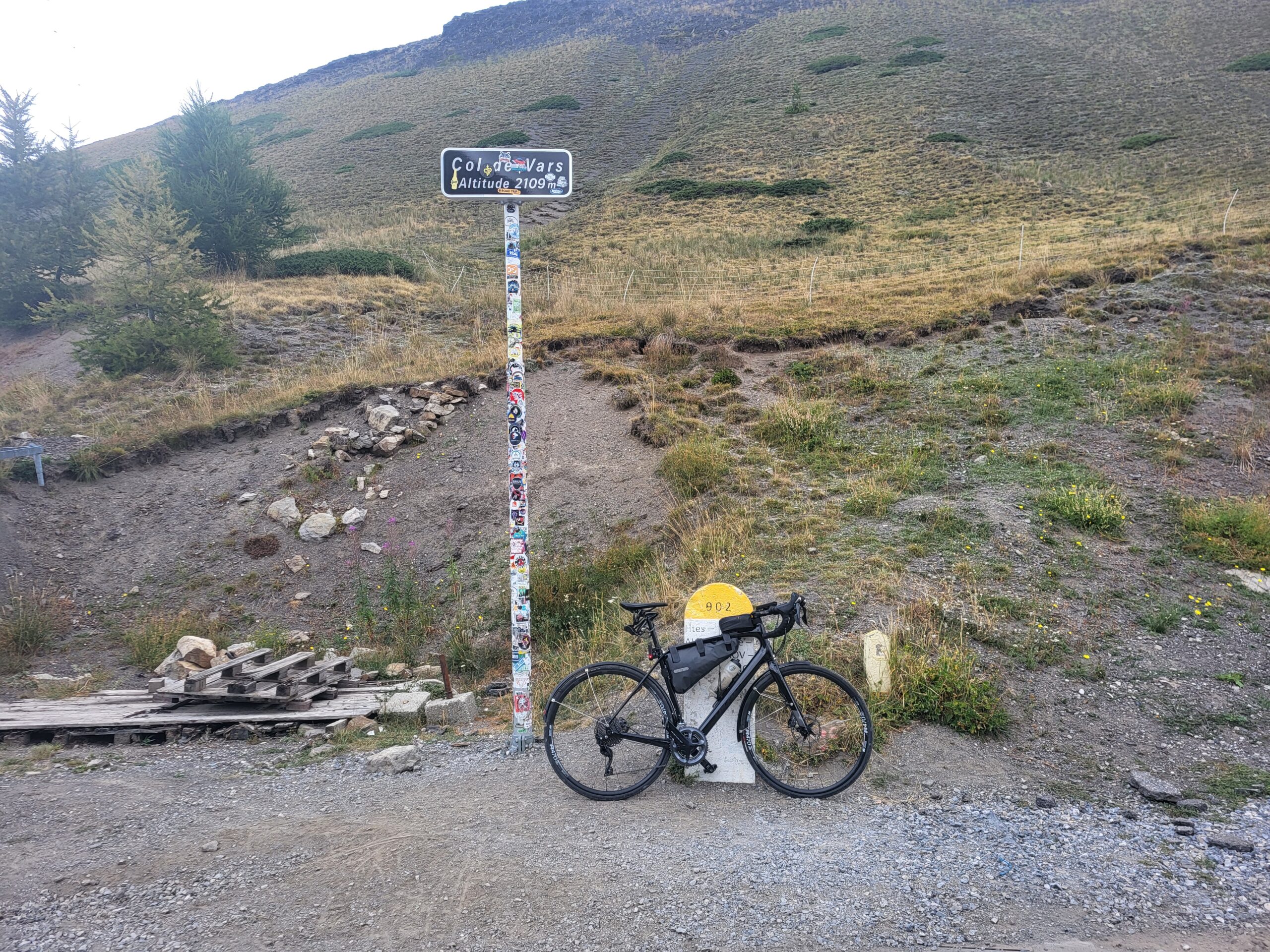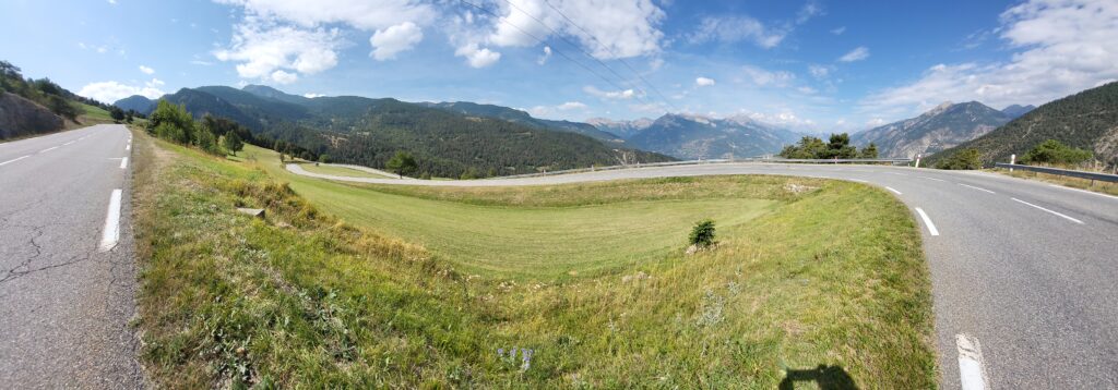 This day I’m going over the Col de Vars. It starts out with a long bit to the start of the climb, which means from Briançon I took the main road five kilometers out of town, and then I turned on to a narrow road on the side. This unfortunately also means that it goes a little bit more up and down, which it did, but you avoid all the traffic on the main roads. The main roads, they do have painted biking lanes. The problem with them is that that’s where all the water and the small pebbles land, and therefore driving on the main roads it’s advisable to actually drive a little bit in on the normal road, and then if a car arrives then go out just when they pass. Anyway, back to the side roads going up and down. The final 10 kilometers I had to go on the main road, but that was because I know the side roads there, and they are even steeper. Anyway, I arrived at the bottom of the col, at the town Gulliestre, after one hour and 45 minutes, 36.6 kilometers, and then it really starts to go upwards. Col du Vars, I know from last year, it’s quite steep in the beginning, and it flattens out a little bit at the end, but only a little bit, and yeah, up it went. Steepness up to 11-12 percent, and it’s very difficult to see where you’re going in the sense of the mountains there. So there’s so many cliffs here and there. Quite early I realised Col de Galibier was still in my legs. After about 11km it flattens out and it even at one point goes a little bit down, and then it goes up to the skiresort Vars, but at that point I was really lacking food, I was hungry, and I was completely lost of energy. So in Vars I had to make an emergency stop at a snack bar, where I met some guys from Zurich, they were doing literally the same tour as I am. I had a panini and 1.6 liters of drinks, and then it turned out that just when I was about to leave Carsten, he was coming in as well, in the car of course, and so I went up the last five kilometers to the Col de Vars 2109m , took a couple of pictures, standard ones of the sign, and then I started the descent to Jausiers, which is 23 kilometers, and that was a quite funny descent, quite good, the road was quite good, it was not very busy, and I descended 11 kilometers. I was a little surprised by two tunnels. The it got warm so the wind jacket was stowed away. 2km later it started raining heavily so I had to stop and take all the rain gear on. Of course I biked for half a kilometer, and then the rain stopped, but then I couldn’t be bothered to take it off again and put it into my bag, so I just drove the last the last nine kilometers to Jausiers in the rain gear, which was quite hot, and arrived at the Four Star Hotel. This was one of the few options that was left when I had to book, but it was a nice hotel with a sauna, pool and at least they have a huge bar, and a pool. Carsten arrivedabout 15min later. It started to rain again. The restaurant at the hotel was a fancy one and I needed pasta not French cuisine. So we went into town 75m long is the main street. All the restaurants and the supermarketwere closed. So we took the car to the next town, Barcelonette, and went to a bit alternative restaurant in the middle of the street, where they just put out like these small pavilions, so even if it was raining and cold, you could sit in there, it was quite nice. It was the end of a good day: Varm and sunny in the morning and cloudy cold and rain during late afternoon and evening.