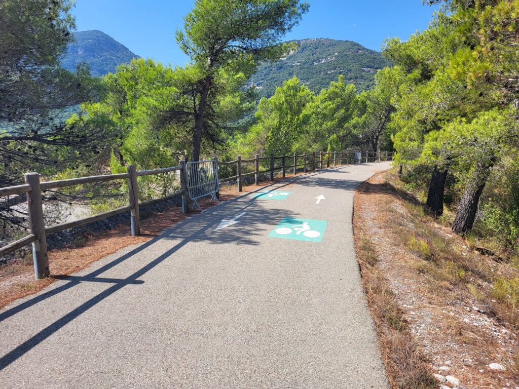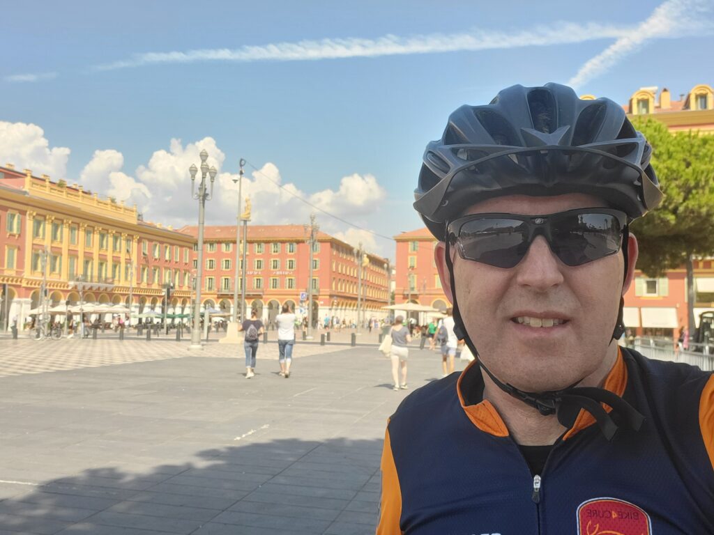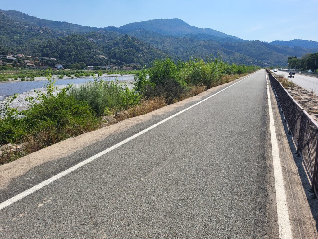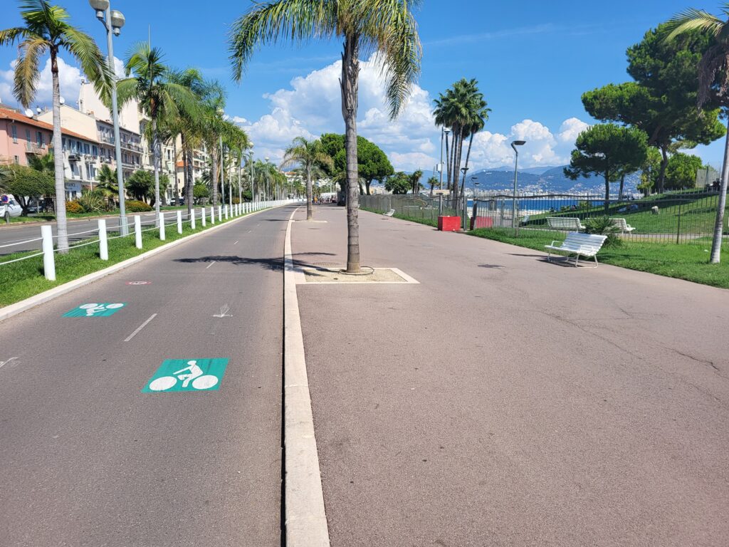 It had been raining all night so it was a cool morning. Just warm enough to drive in short sleeves. The first 5 km went down to the main road. Continuing downwards it was going swiftly forward 40km in 1h10. It was mainly on the main road but with no traffic. Occasionally there was a bike route through woods which was nice but on the other hand you have all the roots from the trees making the route bumby. A firm grip on the handlebar is necessary. After 2 hours I had done 60km and the valley widened and got flat. The last 10km before the road was busier. At 60km the bike route started on the other side of the river Var. It was wide flat but in the baking sun. This went on an on, the road getting less and less good the nearer to the coast. At the end it turned into a small side road with pebbles, garbage on the side. Back on the bike lane with a water filled underpass. Finally I arrived on the bike lane passing the airport and leading to Promenade des anglais the promenade running along the coast by Nice. A quarter to 2 pm I arrived in Nice on Place Massena.