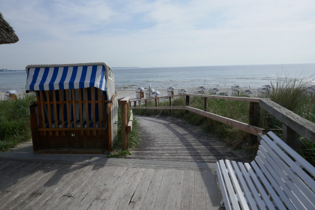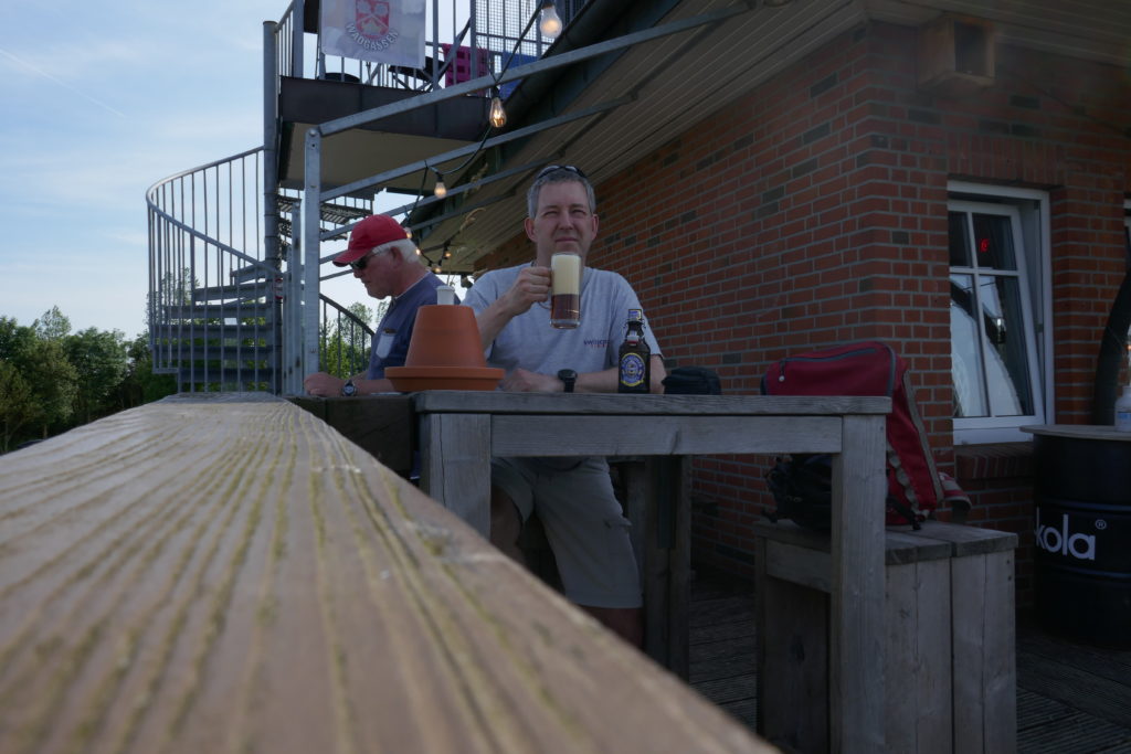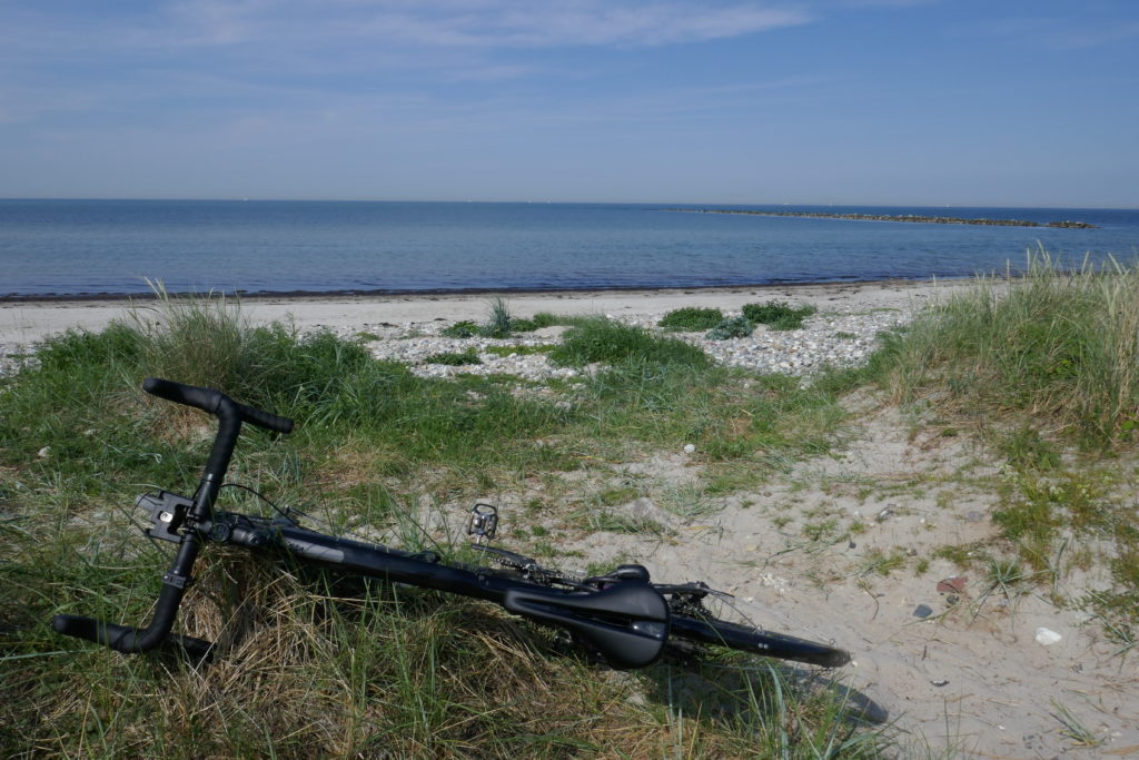 Sitze in einer Strandbar mit einem Bier, es wird Reggae gespielt, die Aussicht über den Fehmarn Belt wo die Autofähren hin und her pendelt zwischen Puttgarden und Rødby Dänemark. Morgen nehme ich die Fähre. Man sieht Dänemark in der Horisont. Die Scharfe die die Deiche instandhalte sind weg, im Westen sieht es sehr Dunkel aus – Donnerwolken. Ich hoffe sie komme nicht zu schnell weil ich habe 3km zum Hotel und ich bin zu Fuss. Bis jetzt sind die Wolken aber nach Norden gezogen. Der Bar schließe nach Sonnenuntergang.